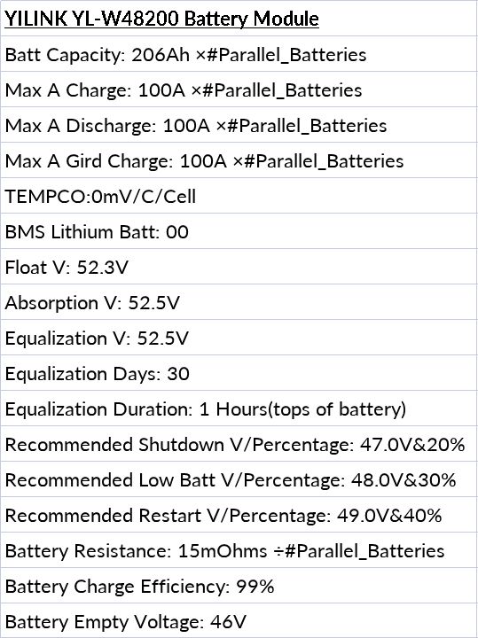 This is a printable image of most common settings for this battery for non BMS communicating inverters such as but not limited to Outback, Schneider, Trace, Xantrex, Growatt, and other non canbus bms inverters.